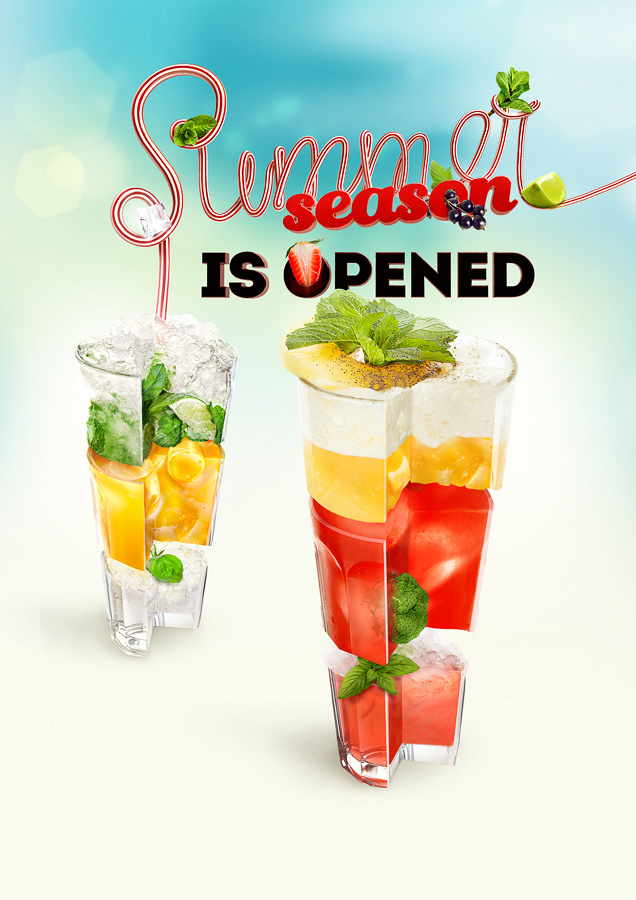 The main idea of the project is word "open". This menu was made in honor of the opening of summer season in the People's bar. All of the elements are "opened": sliced drinks and grill.